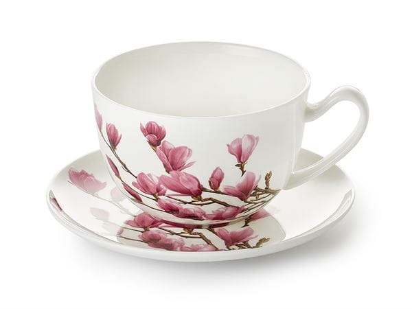 Porcelanowa filiżanka Jumbo ze spodkiem z dekoracją magnolii to propozycja dla osób, które lubią celebrować chwilę z herbatą lub kawą w większej porcji. Pojemność 0,5 l pozwala delektować się ulubionym naparem dłużej, bez konieczności częstego dolewania.