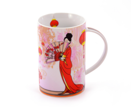 Na powierzchni kubka znajduje się subtelnie stylizowana postać Japonki w tradycyjnym stroju, otoczona dekoracyjnym tłem i kolorowymi akcentami. Wnętrze kubka również zostało ozdobione, dzięki czemu naczynie prezentuje się efektownie z każdej strony.