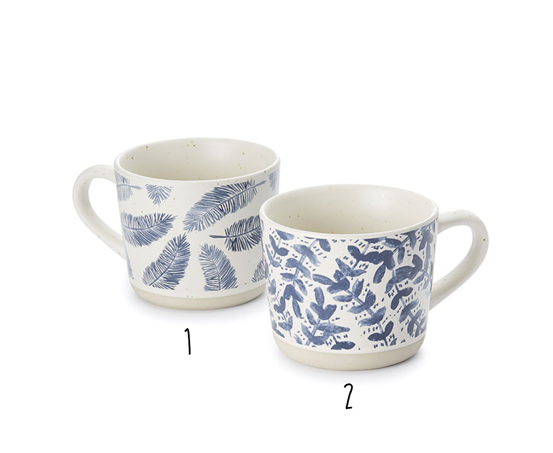 Kubek wykonany jest z grubej ceramiki w kremowym kolorze, ozdobionej niebieskimi, roślinnymi motywami. Szeroki kształt i wygodne ucho sprawiają, że świetnie leży w dłoni i długo utrzymuje temperaturę napoju.