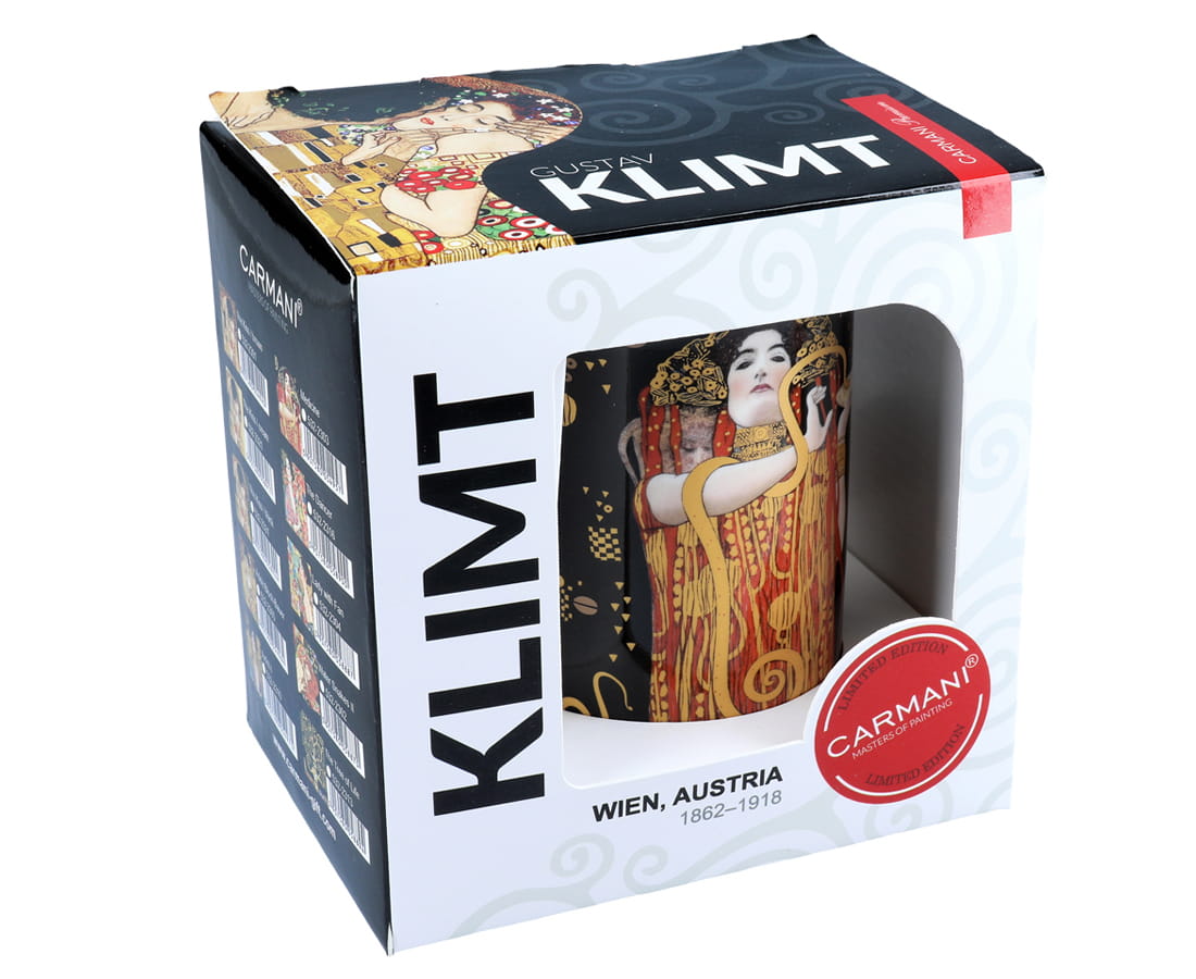 Na powierzchni kubka znajduje się szczegółowa reprodukcja obrazu Klimta, podkreślona dekoracyjnymi spiralami i ornamentami charakterystycznymi dla stylu artysty. Smukły kształt i wygodne ucho sprawiają, że kubek dobrze leży w dłoni, a odpowiednio dobrana pojemność pozwala cieszyć się ulubionym napojem bez konieczności częstego dolewania.